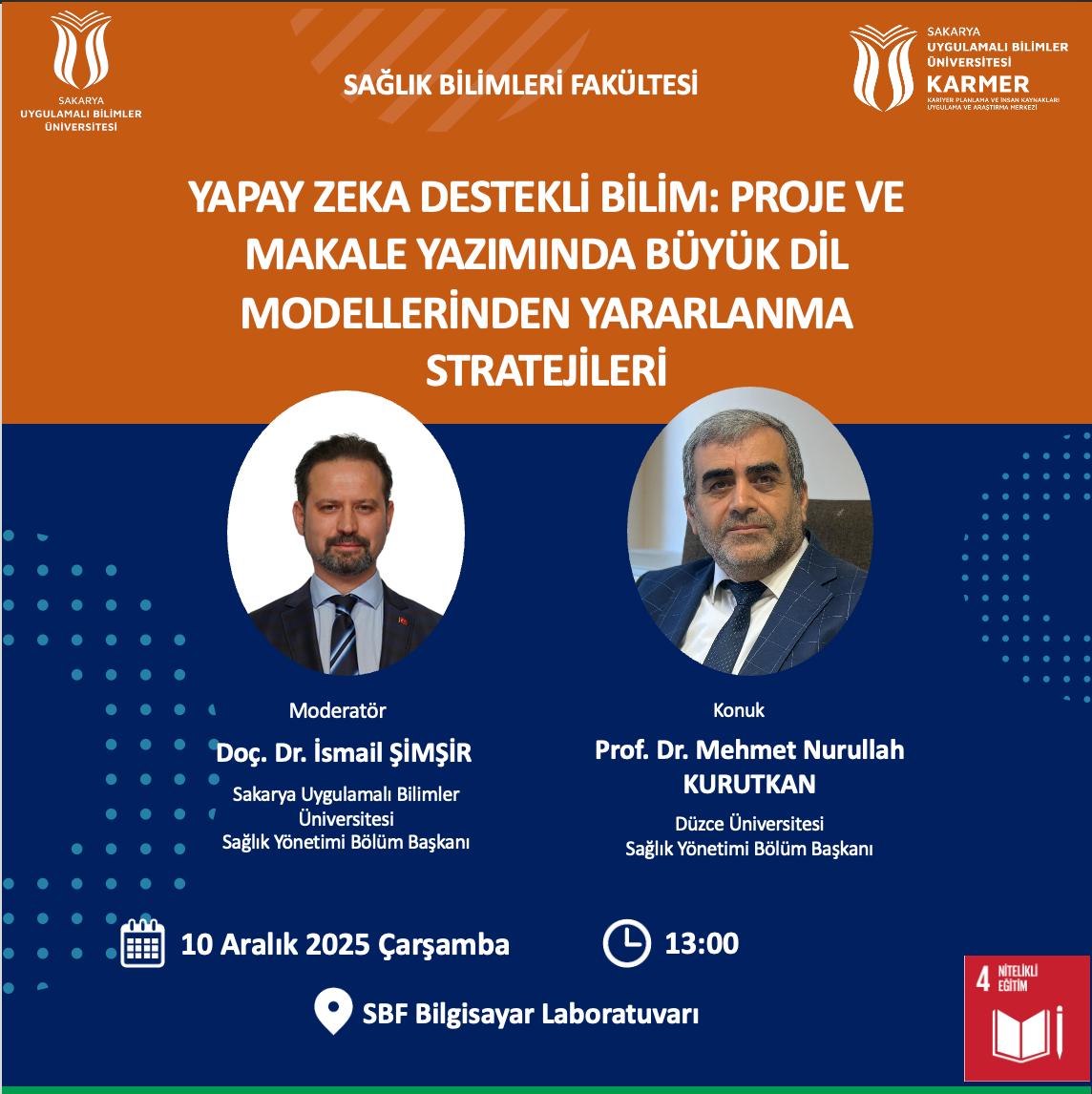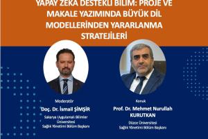 Fakültemizde Sağlık yönetimi bölümü öğretim üyesi Doç. Dr. İsmail Şimşir moderatörlüğünde, Düzce Üniversitesi Sağlık Yönetimi bölüm başkanı Prof. Dr. Mehmet Nurullah Kurutkan tarafından yapay zeka temelli eğitim verilecektir. Bütün hocalarımızın bilgisayarları ile katılımı beklenmektedir.