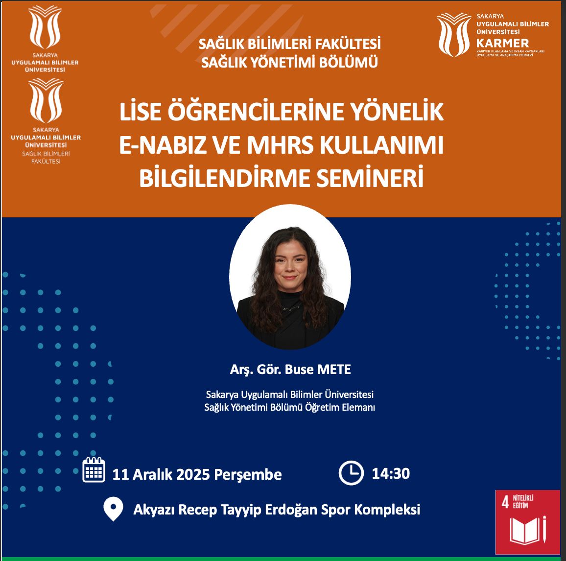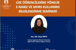 Fakültemiz Sağlık Yönetimi bölümü öğretim elemanı Arş. Gör. Buse METE tarafından düzenlenen “Lise Öğrencilerine Yönelik E-Nabız ve MHRS Kullanımı Bilgilendirme Semineri” etkinliği, 11 Aralık 2025 Perşembe günü saat 14.30’da Akyazı Recep Tayyip Erdoğan Spor Kompleksi’nde gerçekleştirilecektir.
