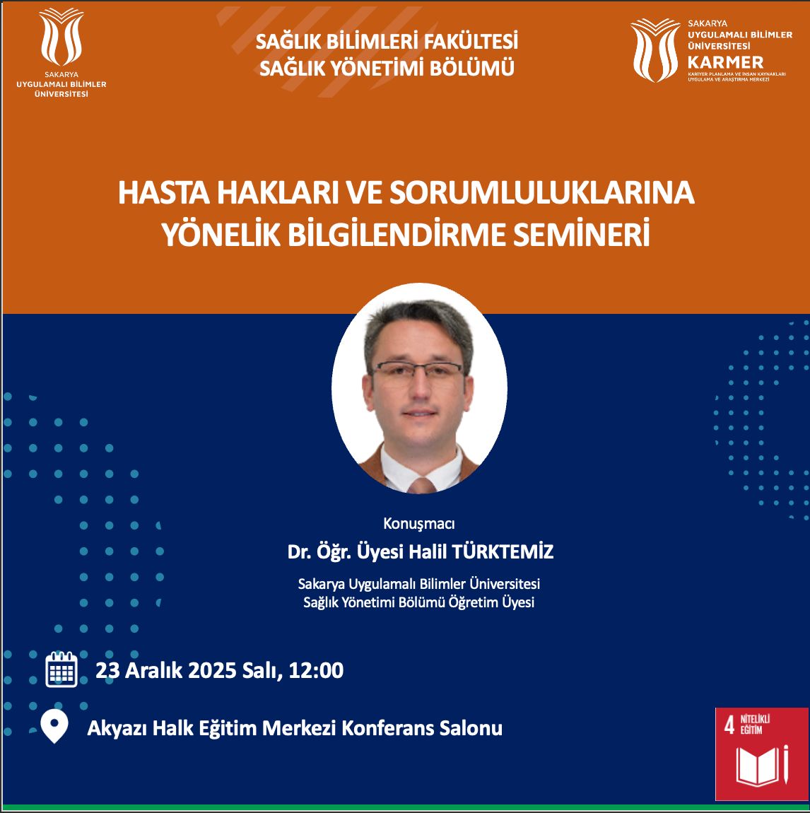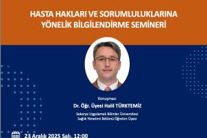 Sağlık Yönetimi bölümünde, Dr. Öğr. Üyesi Halil Türktemiz tarafından Akyazı Halk Eğitim Merkezinde kadınlara yönelik “Hasta Hakları ve Sorumluluklarına Yönelik Bilgilendirme Semineri” isimli etkinlik düzenlenecektir.