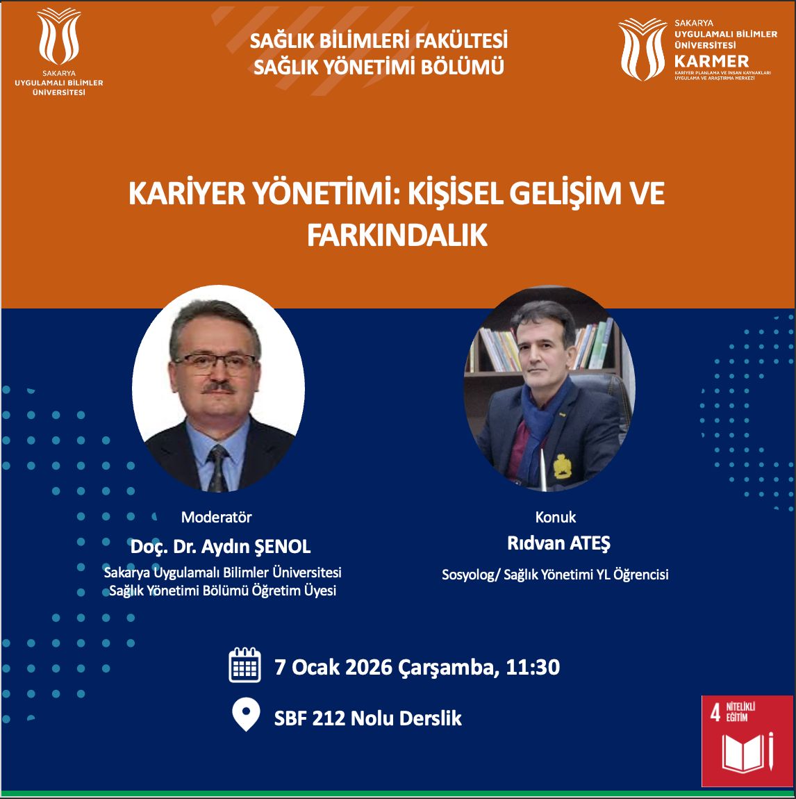 Fakültemiz Sağlık Yönetimi bölümünde, Doç. Dr. Aydın Şenol moderatörlüğünde sayın Rıdvan Ateş tarafından “Kariyer Yönetimi: Kişisel Gelişim ve Farkındalık” etkinliği düzenlecektir. Öğrencilerimizin katılımını bekleriz.