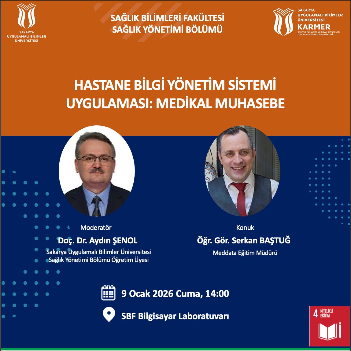 Fakültemiz Sağlık Yönetimi bölümünde Doç. Dr. Aydın Şenol moderatörlüğünde, Meddata Eğitim Müdürü Serkan Baştuğ’un katılımı ile “Hastane Bilgi Yönetim Sistemi Uygulaması: Medikal Muhasebe” etkinliği düzenlecektir.