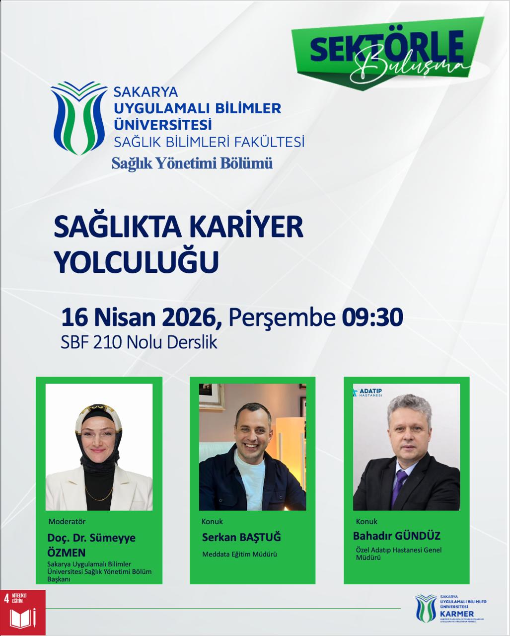 Sağlık Yönetimi Bölümünde Bölüm Başkanı Doç. Dr. Sümeyye Özmen moderatörlüğünde, Meddata Eğitim Müdürü sayın Serkan Baştuğ ve Adatıp Hastanesi Genel Müdürü sayın Bahadır Gündüz’ün katkıları ile “Sağlıkta Kariyer Yolculuğu” isimli etkinlik gerçekleştirilecektir. Tüm öğrencilerimiz davetlidir.