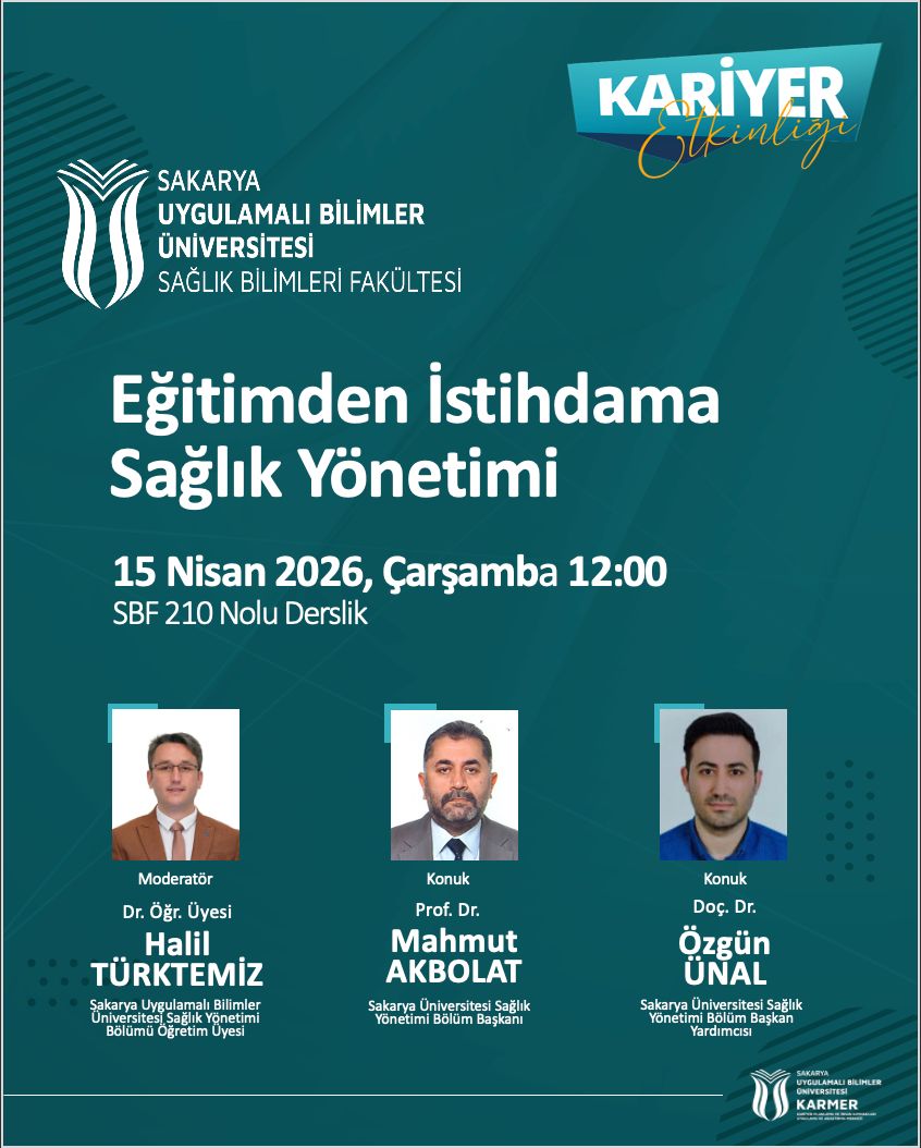 Sağlık Yönetimi Bölümünde kariyer etkinlikleri kapsamında, Dr. Öğr. Üyesi Halil Türktemiz moderatörlüğünde “Eğitimden İstihdama Sağlık Yönetimi” konulu etkinlik düzenlecektir. Etkinliğe tüm öğrencilerimiz davetlidir. Galeri